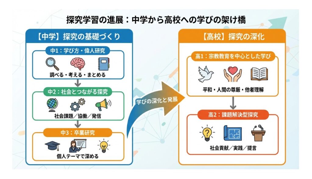 高等学校の探究学習は、建学の精神と宗教教育を基盤に、平和・人間の尊厳・他者理解を深く考える2年間のプログラムです。
