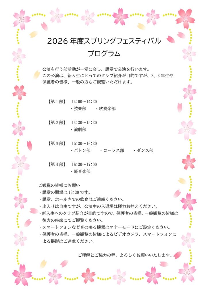 毎年恒例の発表系クラブによる講堂発表会「スプリングフェスティバル」を開催いたします。本イベントは新入生への部活動紹介を目的とした行事ですが、今年度より一般の皆様や受験生の方々にも広く公開することとなりました。