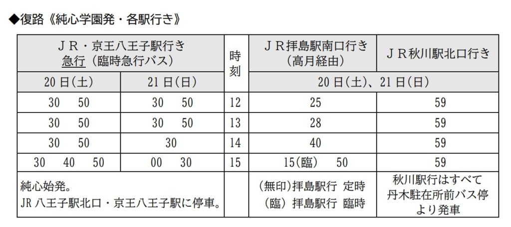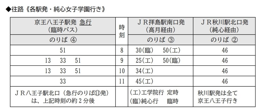 八王子方面から上記の時間帯で臨時急行バス以外をご利用の場合は、次のバスをご利用ください。
