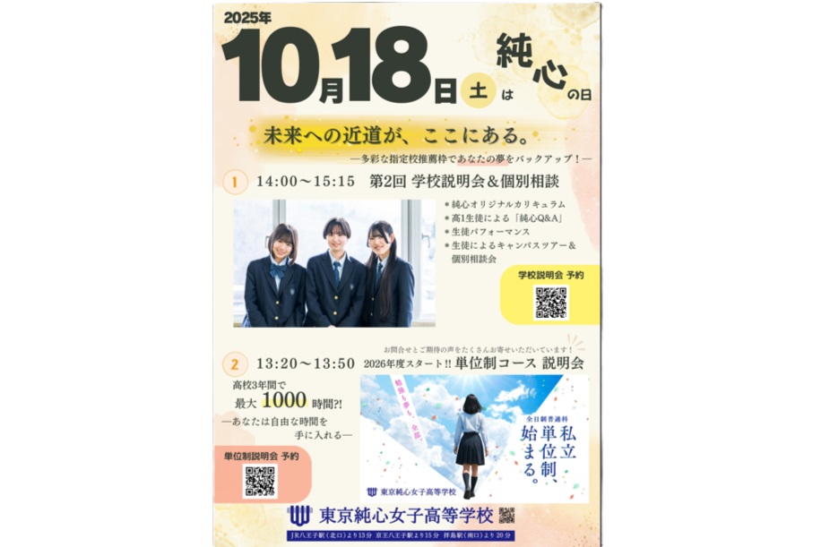 次回の高校入試説明会は、11月22日(土)と12月6日(土)に開催します。今回は「高校説明会・個別相談会」として、純心オリジナルカリキュラムや大学合格実績のご紹介に加え、個別相談を中心に行います。個別相談会では、入試や高校生活について、より具体的にお話しさせていただきます。両日とも内容は同一です。