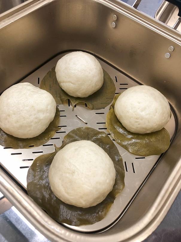 葉っぱ(サルトリイバラ:長崎ではかからの葉、といいます)にのせ、蒸し器で10分間蒸します。