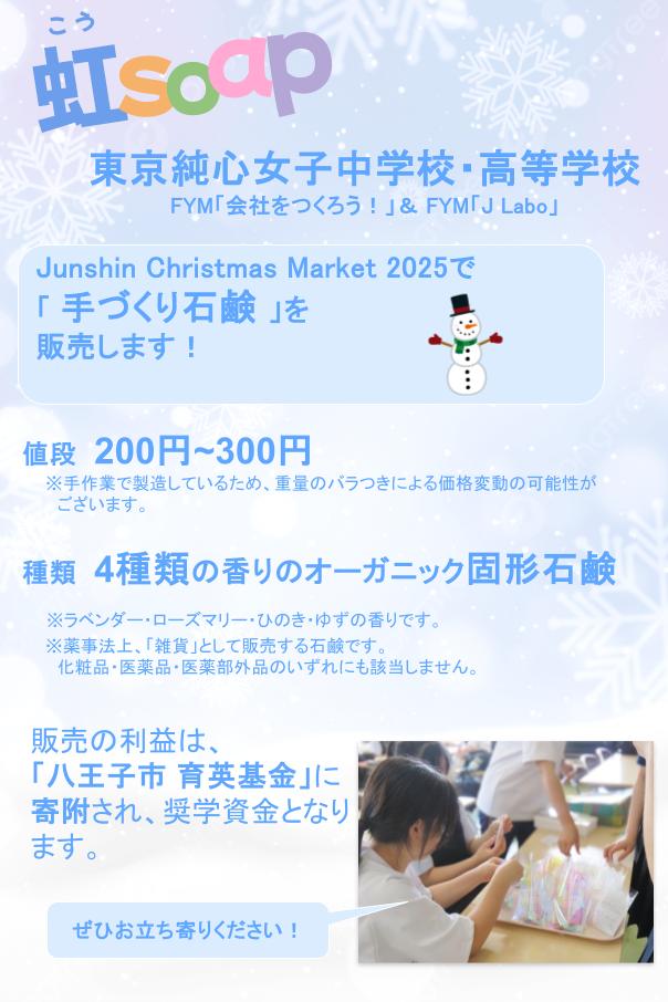 コンサートと同時開催の「Junshin Christmas Market」に、中高FYM「会社をつくろう!」の生徒たちが出店をさせていただきます。今回参加し、商品を販売するのは、「虹Soap」を運営する中学1年生です。