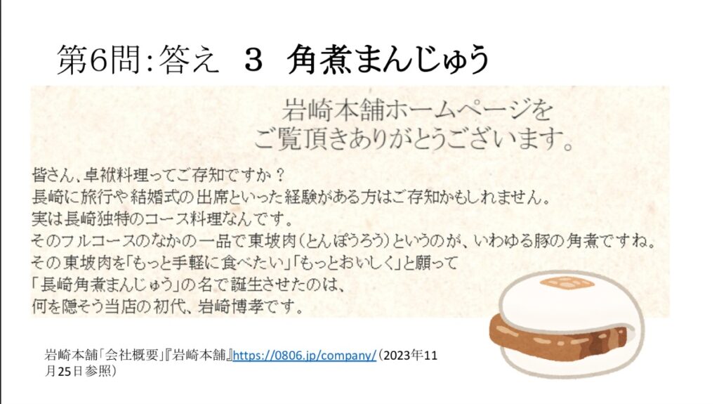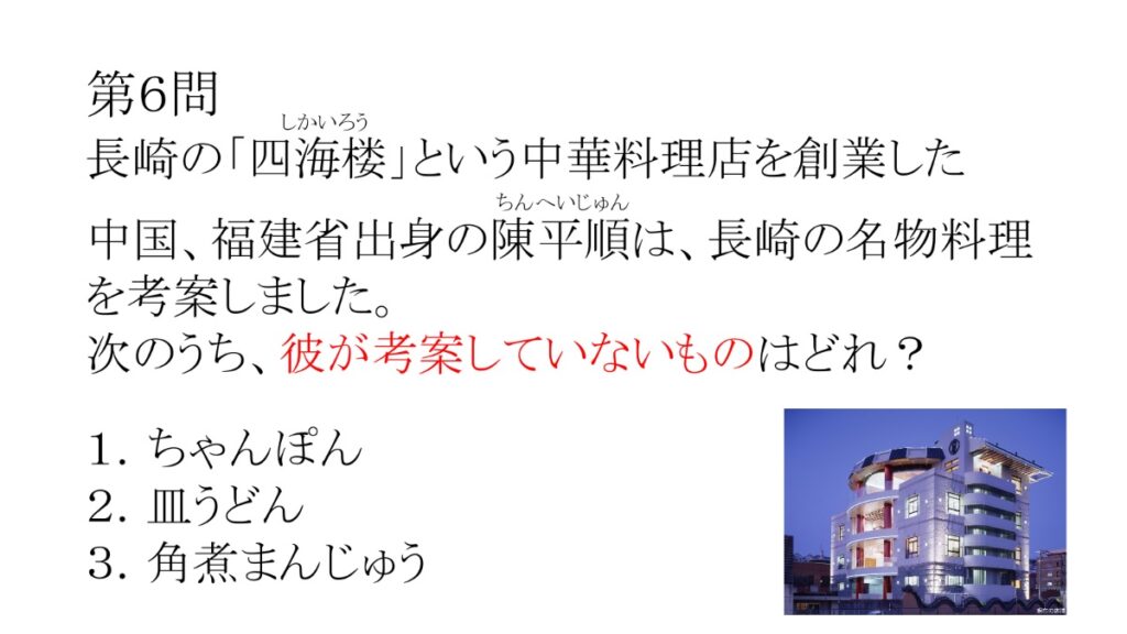 クイズでは、「長崎に落ちた原爆の名前とは?」や「カステラで有名な福砂屋は創業何年でしょう?」など長崎に関する問題を15問解きました。