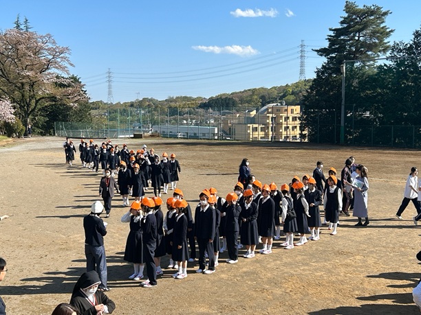 避難後の整列の様子。教室から避難をしたクラスはヘルメットを着用しています。
