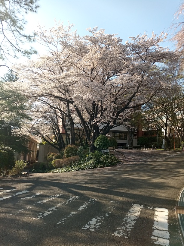 春は桜です!これは食堂前に咲いている桜がとても綺麗だったので、外でお昼ごはんを食べたときの写真です。