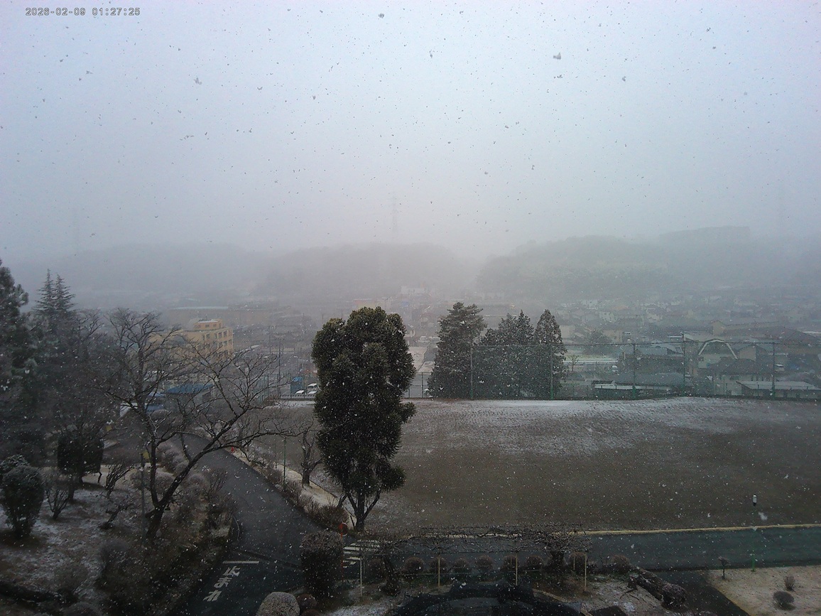 拝島駅方面のバス停から大学校舎を。やっぱり真っ白。