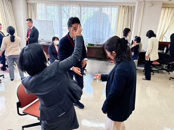 ペアで緊張をほぐす挨拶の練習をしたり、グループで知恵を出し合って意思疎通を図るゲームをしたりと、会場は終始笑い声の絶えない「和気あいあい」とした雰囲気に包まれました。