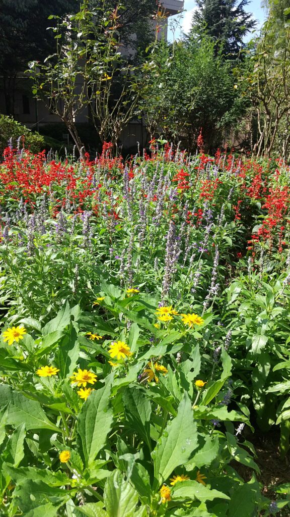 おや、クレオメ(風蝶草)が赤くなっています。花壇は花盛り。