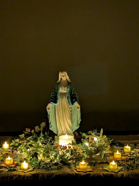 など、たくさんの「感謝」があふれだしました。写真は、「感謝のつどい」のときにキャンドルを捧げたマリア様の像です。暗い中に、キャンドルがキラキラして、とてもきれいでした。