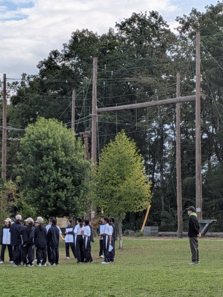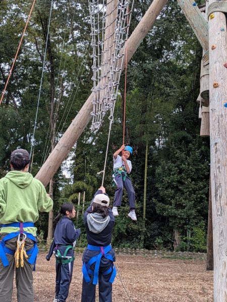 10月の24日と25日に、中学1年生が高尾の森わくわくビレッジに行きました。今回が2回目の訪問です。春にわくわくビレッジに行ったときは、友達との「交流」がメインでしたが、今回の学年研修では仲間との「協力」がメインとなった、プロジェクトアドベンチャー(PA)やピザ作りなどをしました。
